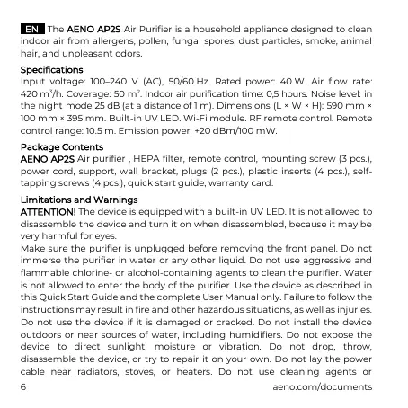 EN The AENO AP2S Air Purifier is a household appliance designed to clean