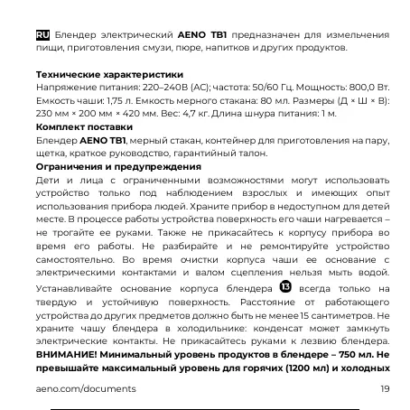 RU Блендер электрический AENO TB1 предназначен для измельчения