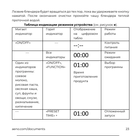 Таблица индикации режимов устройства (см. рисунок e).