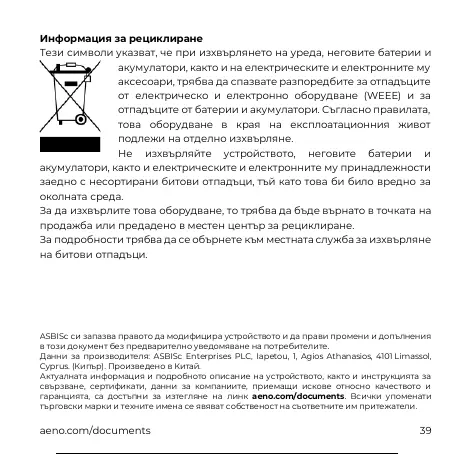 гаранцията, са достъпни за изтегляне на линк aeno.com/documents. Всички упоменати
