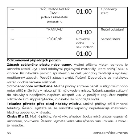 Chyby E1 a E2. Možné příčiny: Velké víko a/nebo nádoba mixéru jsou nesprávně