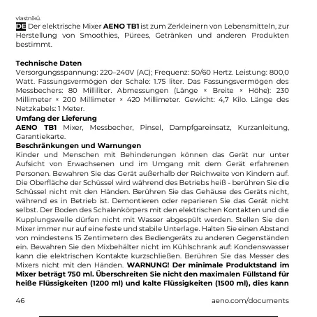 DE Der elektrische Mixer AENO TB1 ist zum Zerkleinern von Lebensmitteln, zur