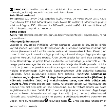 ET AENO TB1 elektriline blender on mõeldud toidu peenestamiseks, smuutide,