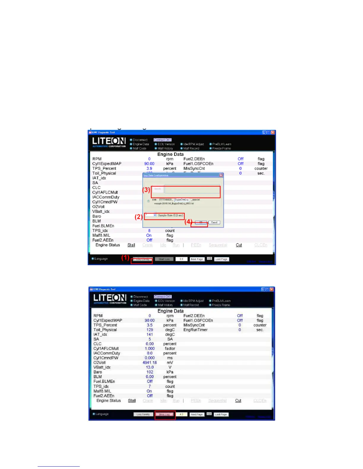 The procedure of the engine operation parameters are : (1) press “Log Config”; (2) Choose “Sampling Rate”(Period); (3)