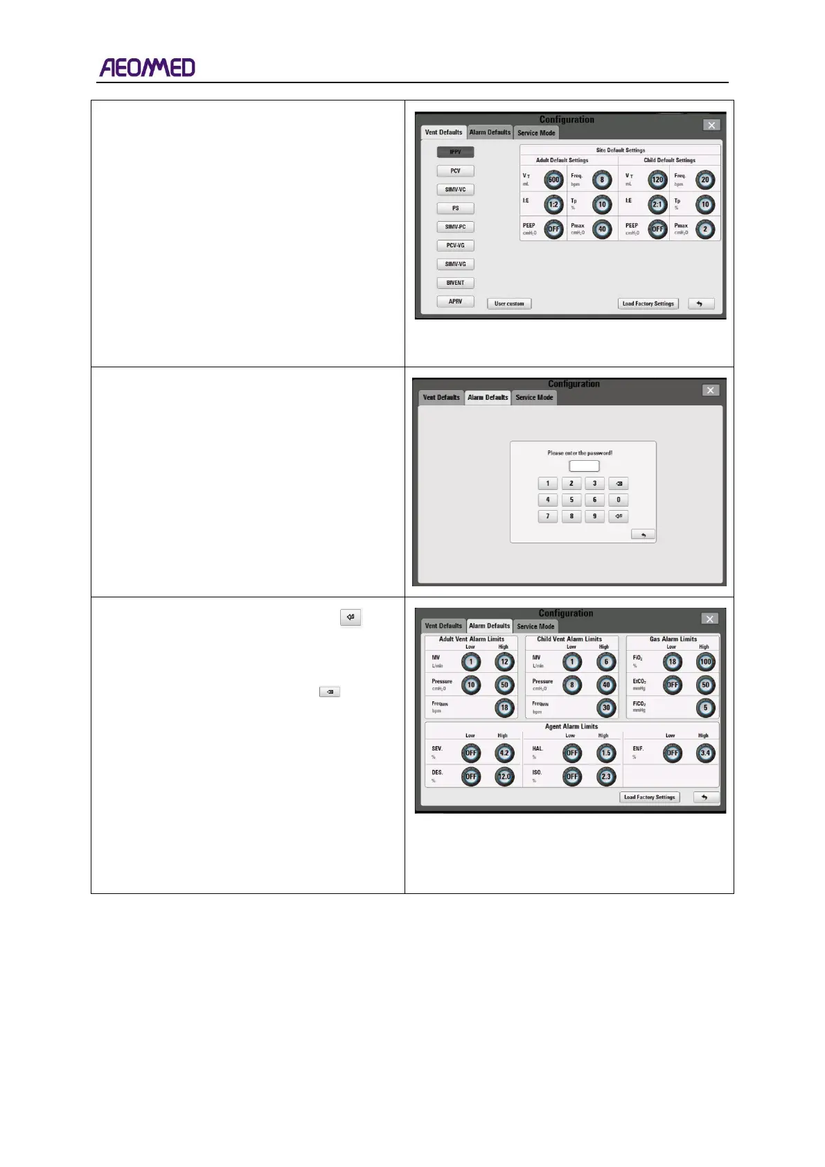 Defaults” tab, including Adult Vent Alarm