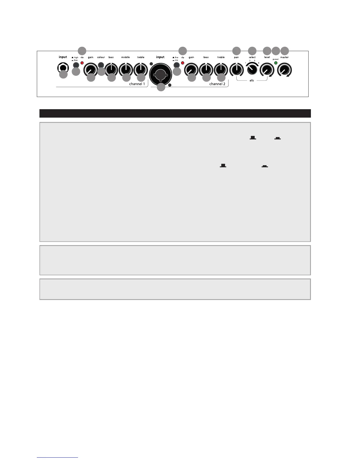 1) input (ch. 1) Signaleingang-Buchse für 6,3 mm Mono-Klinkenstecker