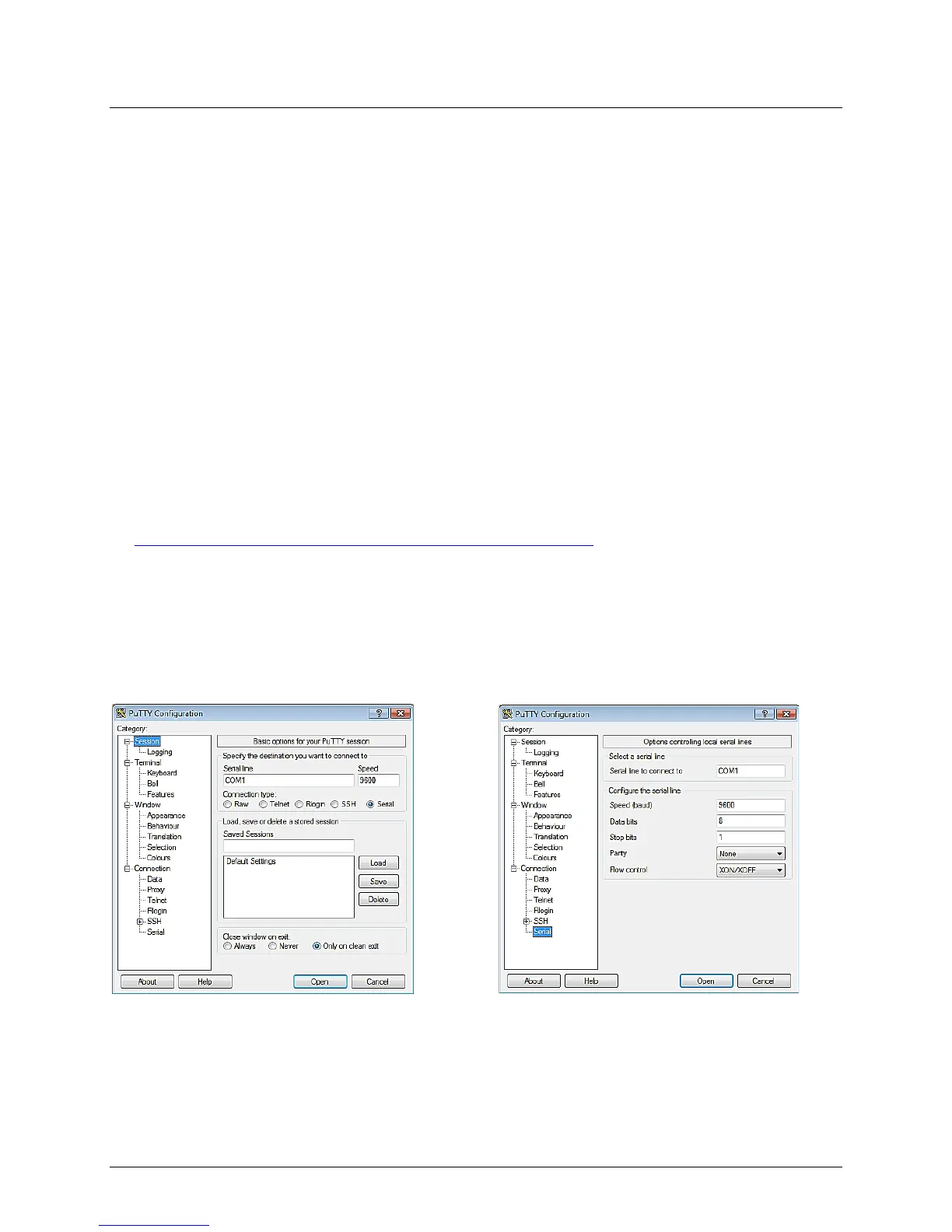 Figure 9-1: PuTTY GUI: Basic Serial Session (L) and Serial Options (R)