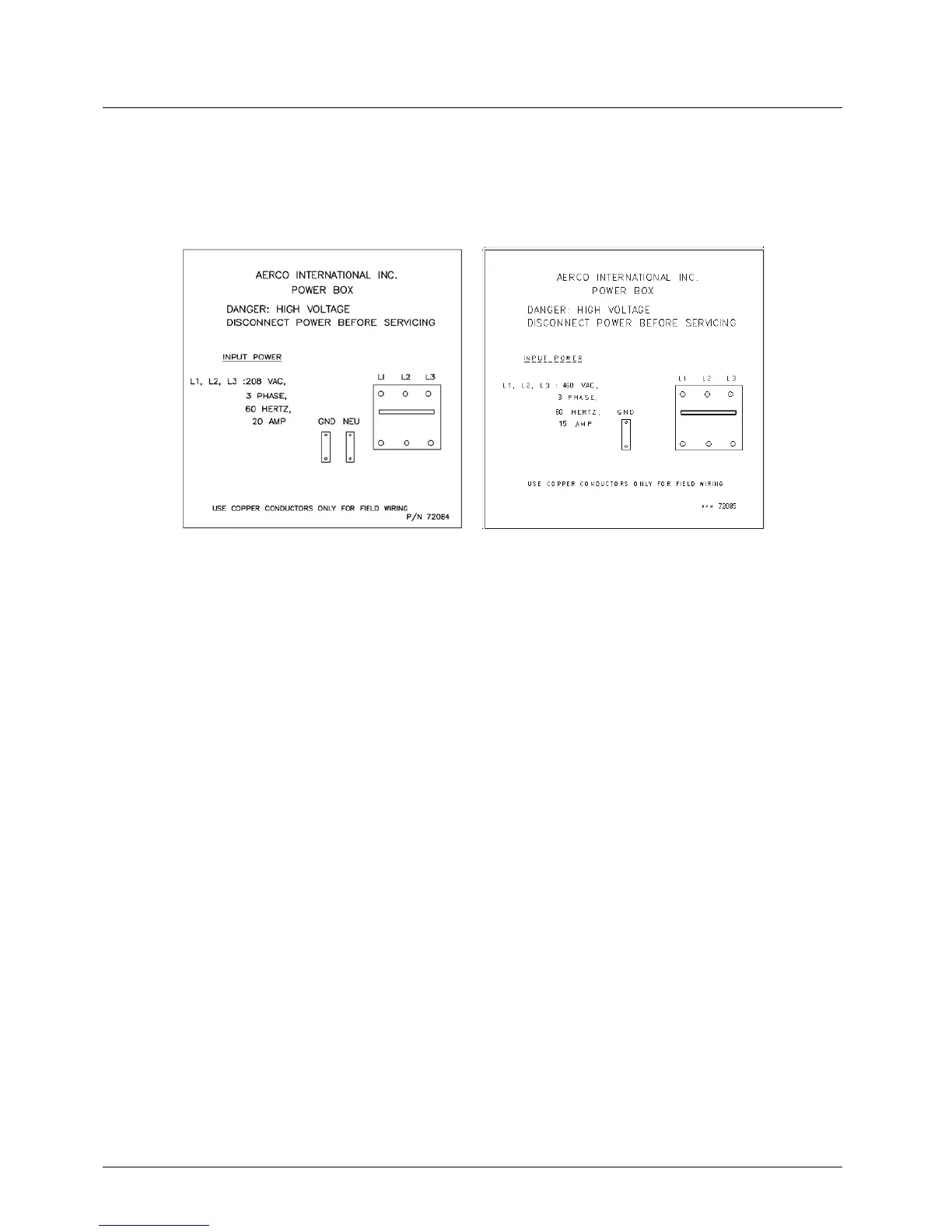 Figure 2-11: Power Box Cover Labels – 208VAC (Left) and 460VAC (Right)