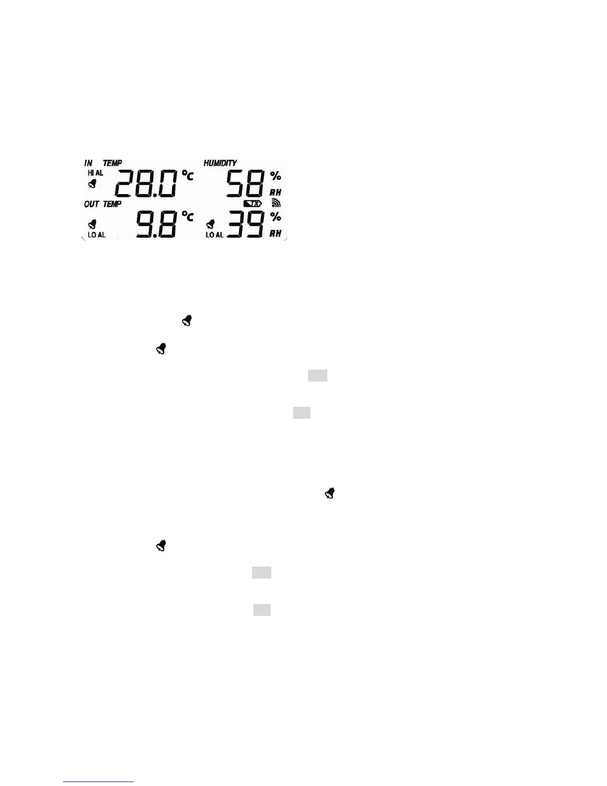 Indoor temperature low alarm (press ON/OFF to enable/disable). If the alarm is enabled, an alarm