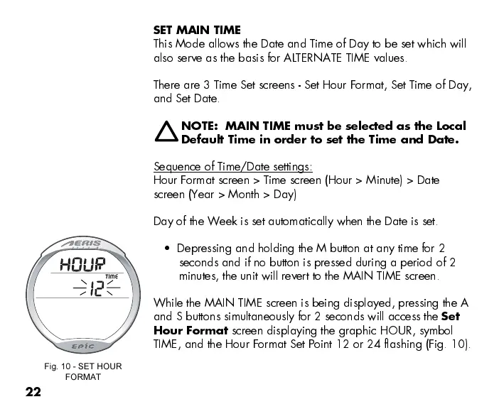 TIME, and the Hour Format Set Point 12 or 24 flashing (Fig. 10).