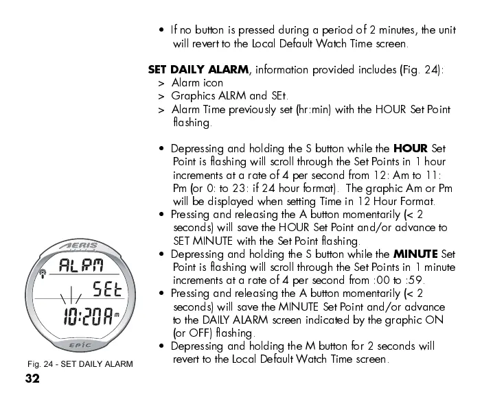 > Alarm Time previously set (hr:min) with the HOUR Set Point