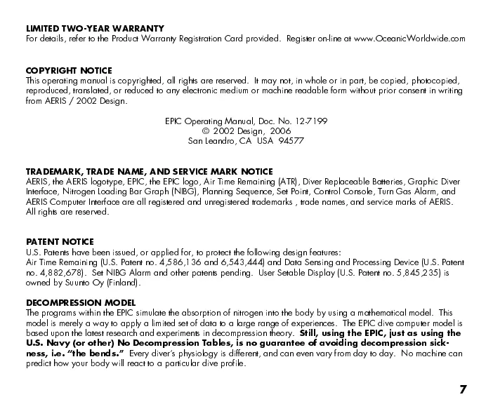 AERIS, the AERIS logotype, EPIC, the EPIC logo, Air Time Remaining (ATR), Diver Replaceable Batteries, Graphic Diver