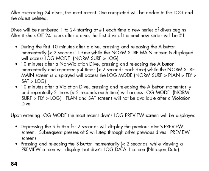 PREVIEW screen will display that dive s LOG DATA 1 screen (Nitrogen Data).