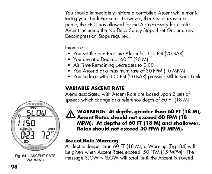 At depths deeper than 60 FT (18 M), a Warning (Fig. 84) will