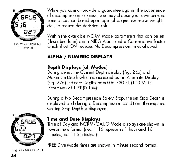 During dives, the Current Depth display (Fig. 26a) and