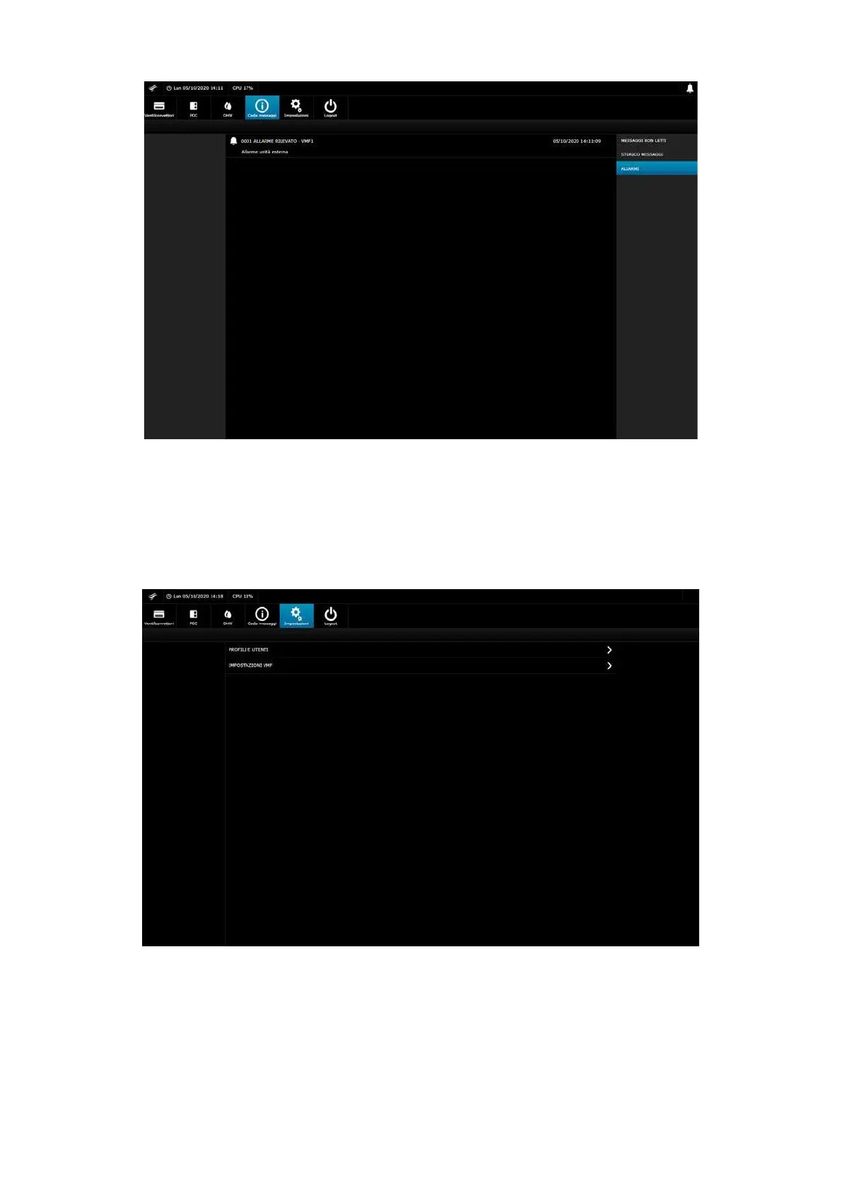 Im Fall aktiver Alarme wird der Bildschirm der Alarme angezeigt. Alle nicht mehr aktiven Alarme werden dann in die nicht gelesenen Meldungen aufgenommen, sind sie stummgeschaltet, d. h. durch den