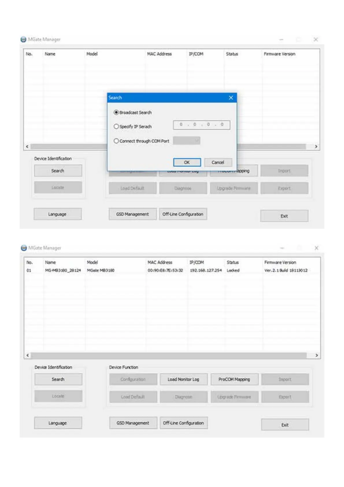 3. Den Such-Prozess der Vorrichtungen MB3180 durch Betätigung der Taste “Suche” starten und die Suche im Broadcast-Modus bestätigen.