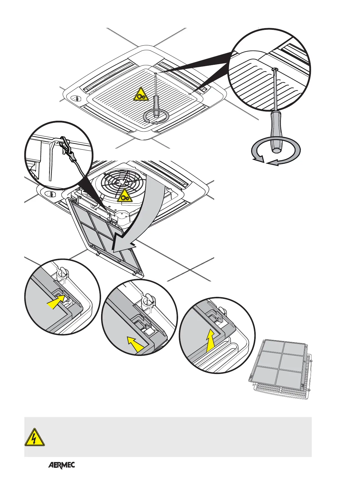PERICOLO: Togliere tensione prima d’iniziare le operazioni di pulizia del filtro e/o dell’unità.
