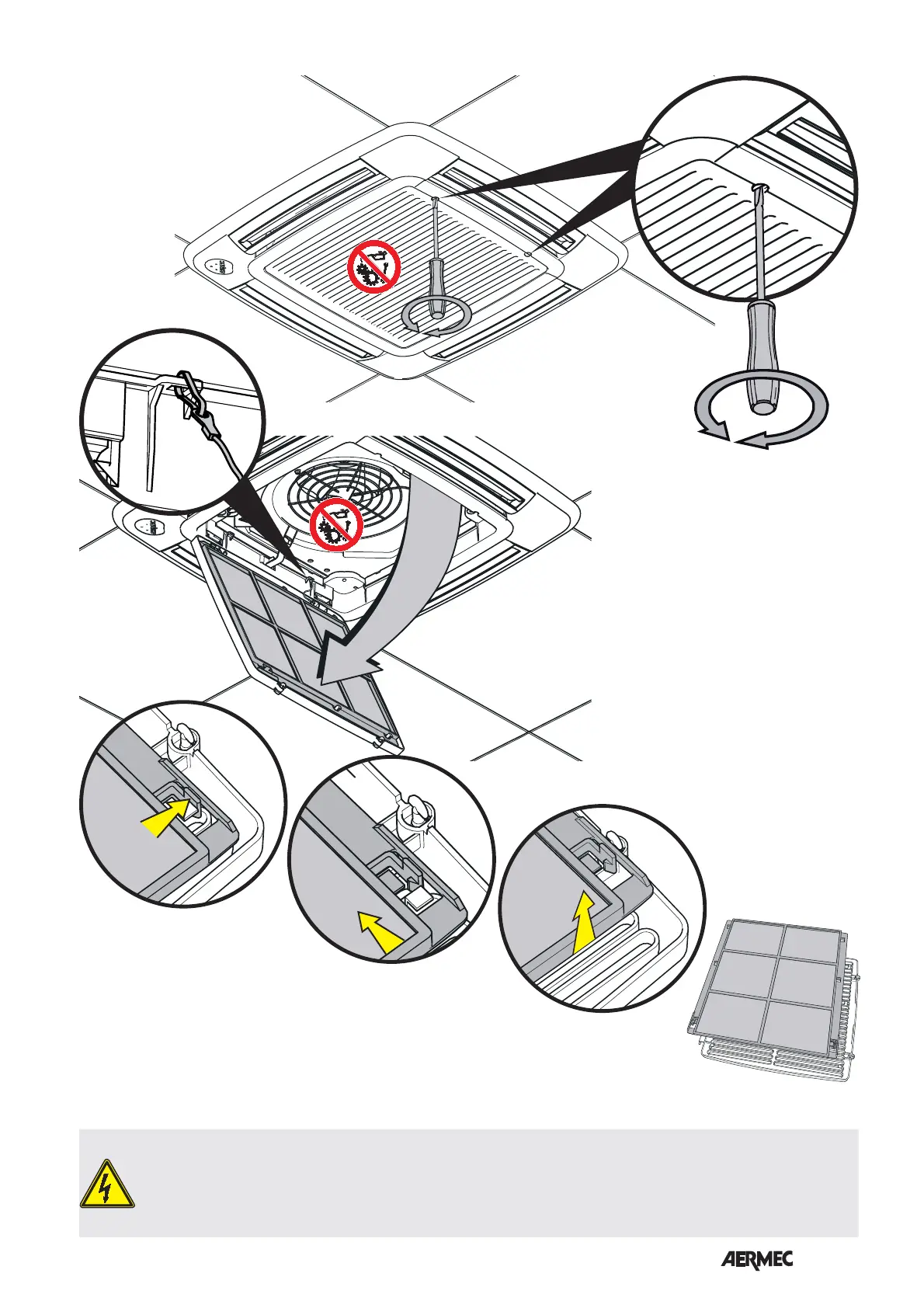 PERICOLO: Togliere tensione prima d’iniziare le operazioni di pulizia del filtro e/o dell’unità.