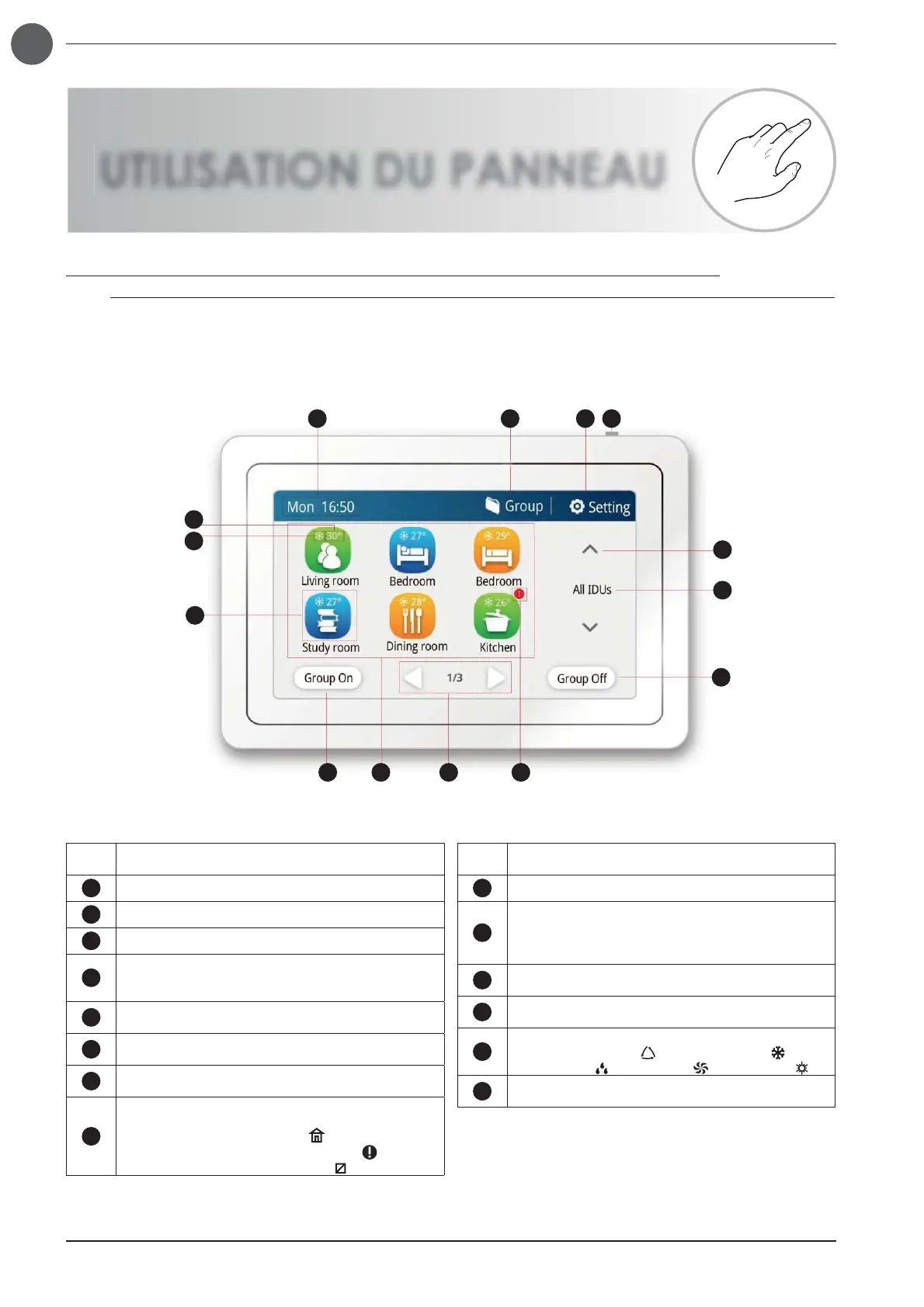 principale, qui permet de contrôler facilement l'état de toutes les unités gérées par l'accessoire, et des pages spécifiques pour
