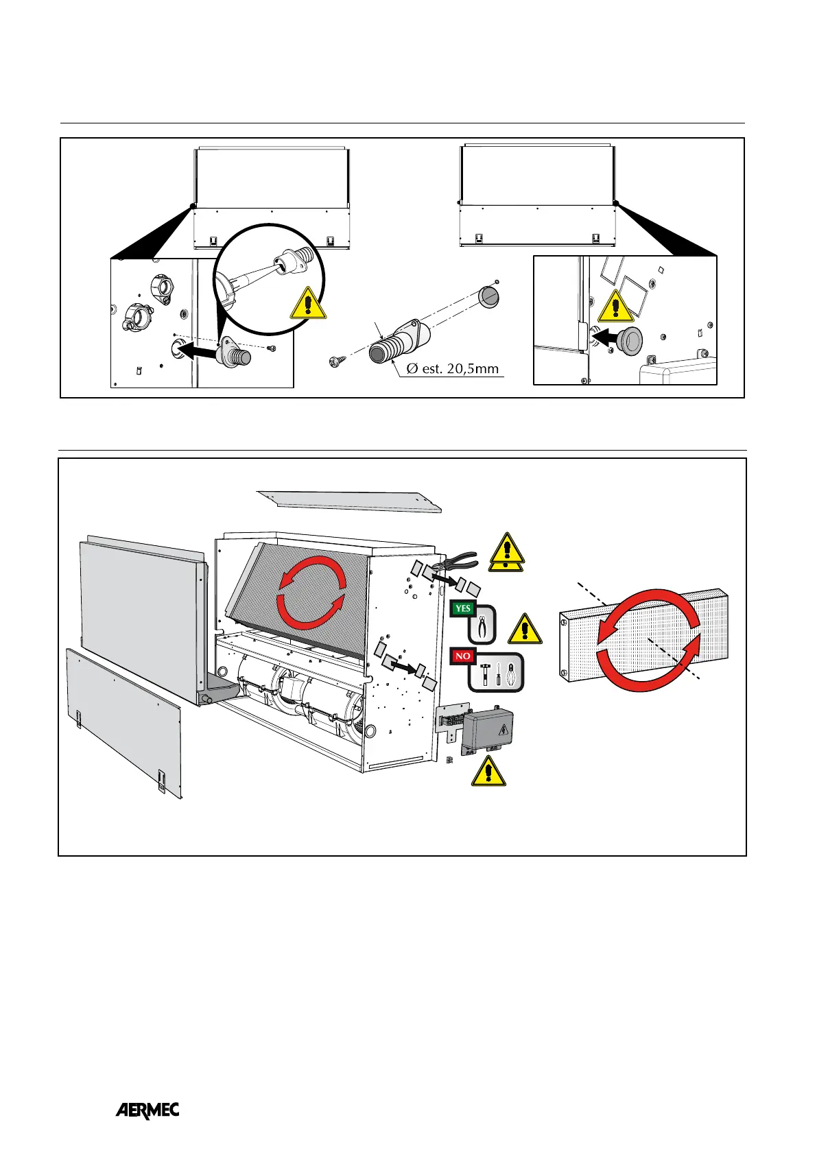 AERMEC VED 641 - Scarico Condensa • Condensate Discharge Connection • Évacuation des Condensats • Kondensatablass • Descarga de Condensación; Rotation des Wärmetauschers • Rotación de la Batería