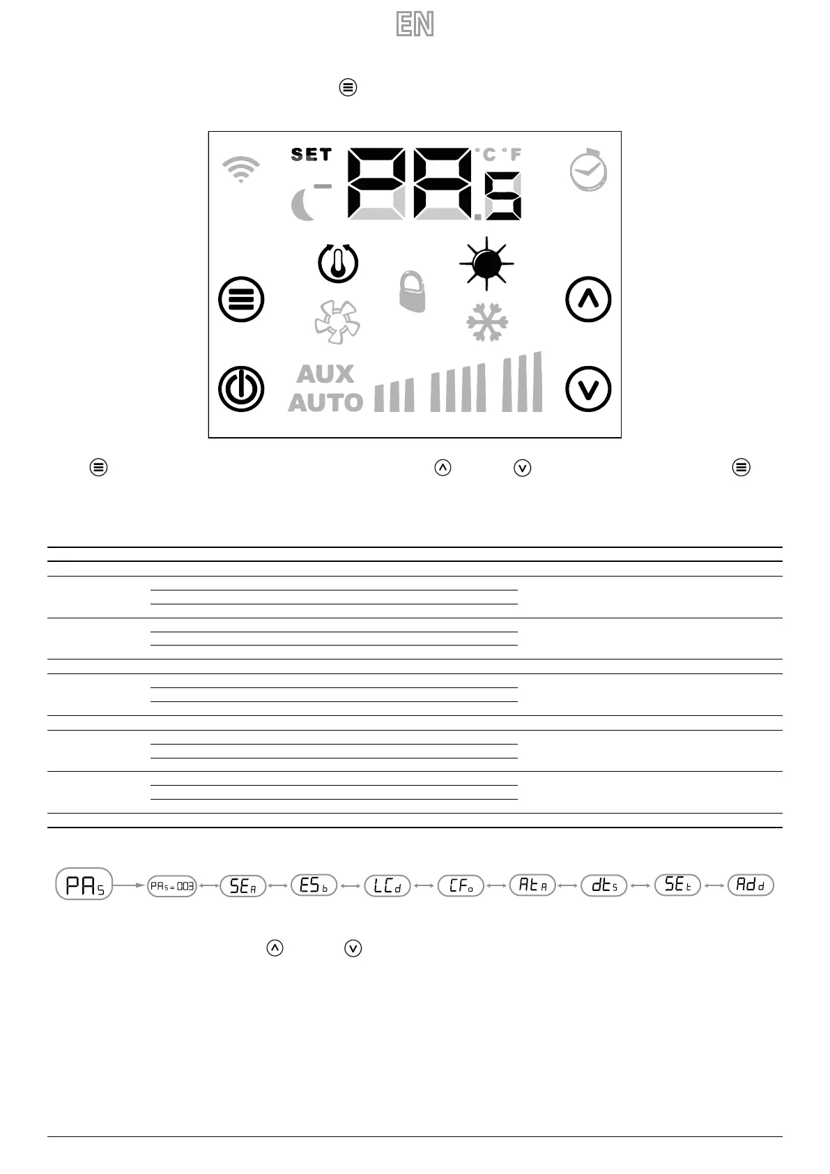 To enter the parameterisation pages, press the Mode/Select button the suitable submenu for the type of installation and the functional necessity can be selected from