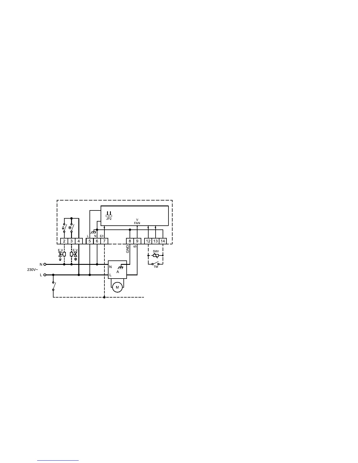 Esquema de conexión para el pilotaje de dos actuadores on/off a 230V~ para instalación a 4 tubos y pilotaje prporcional del ventilador.