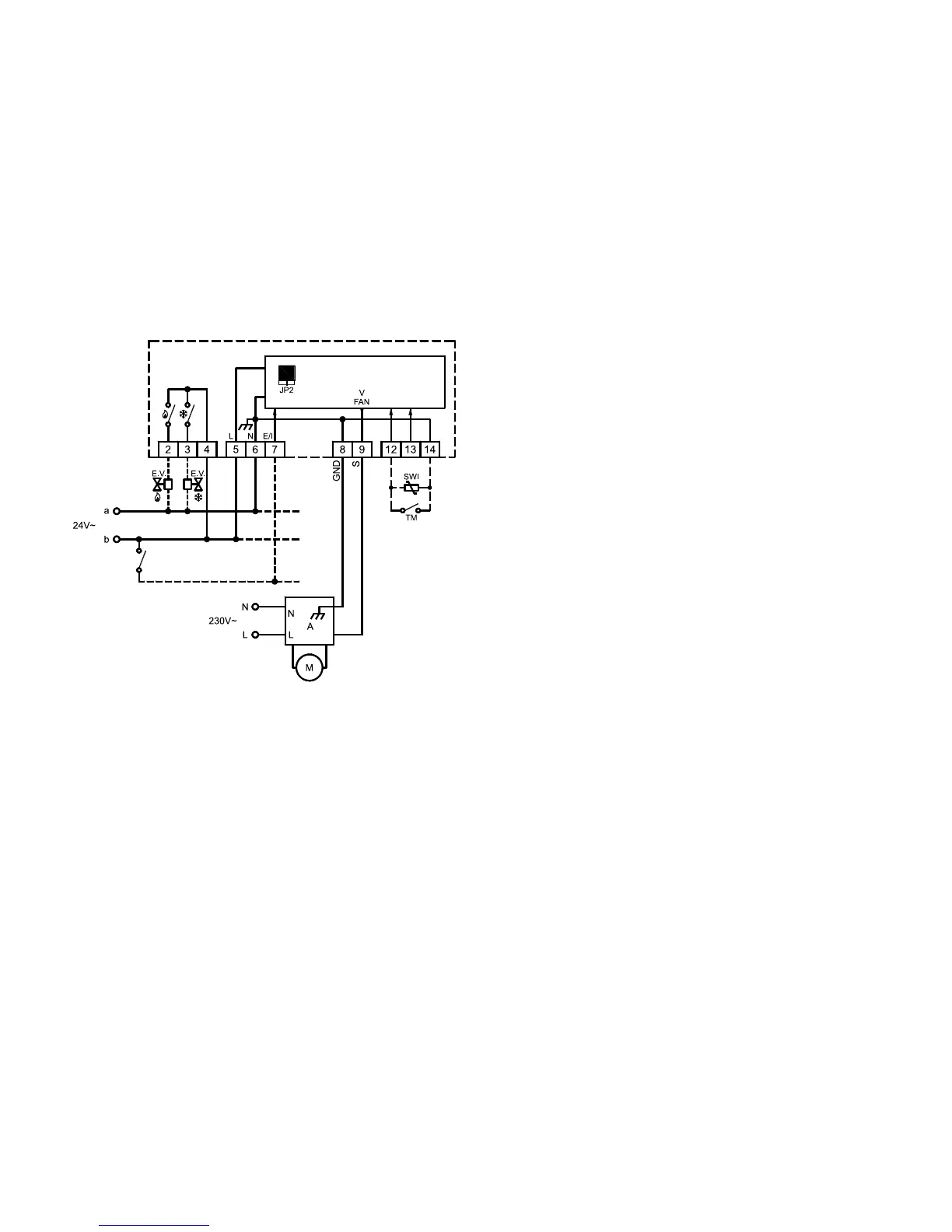 Wiring diagram for 2 on/off 24V~ actuators in 4 pipes system and proportional fan drive.