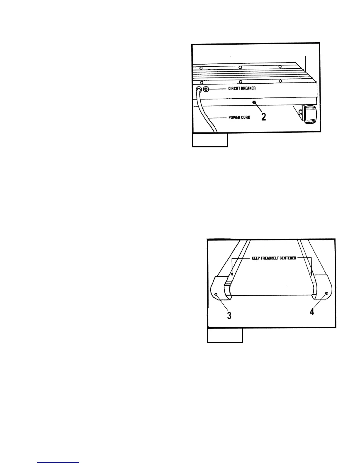 Locate the two tread belt adjustment screws (3) and (4) as shown.