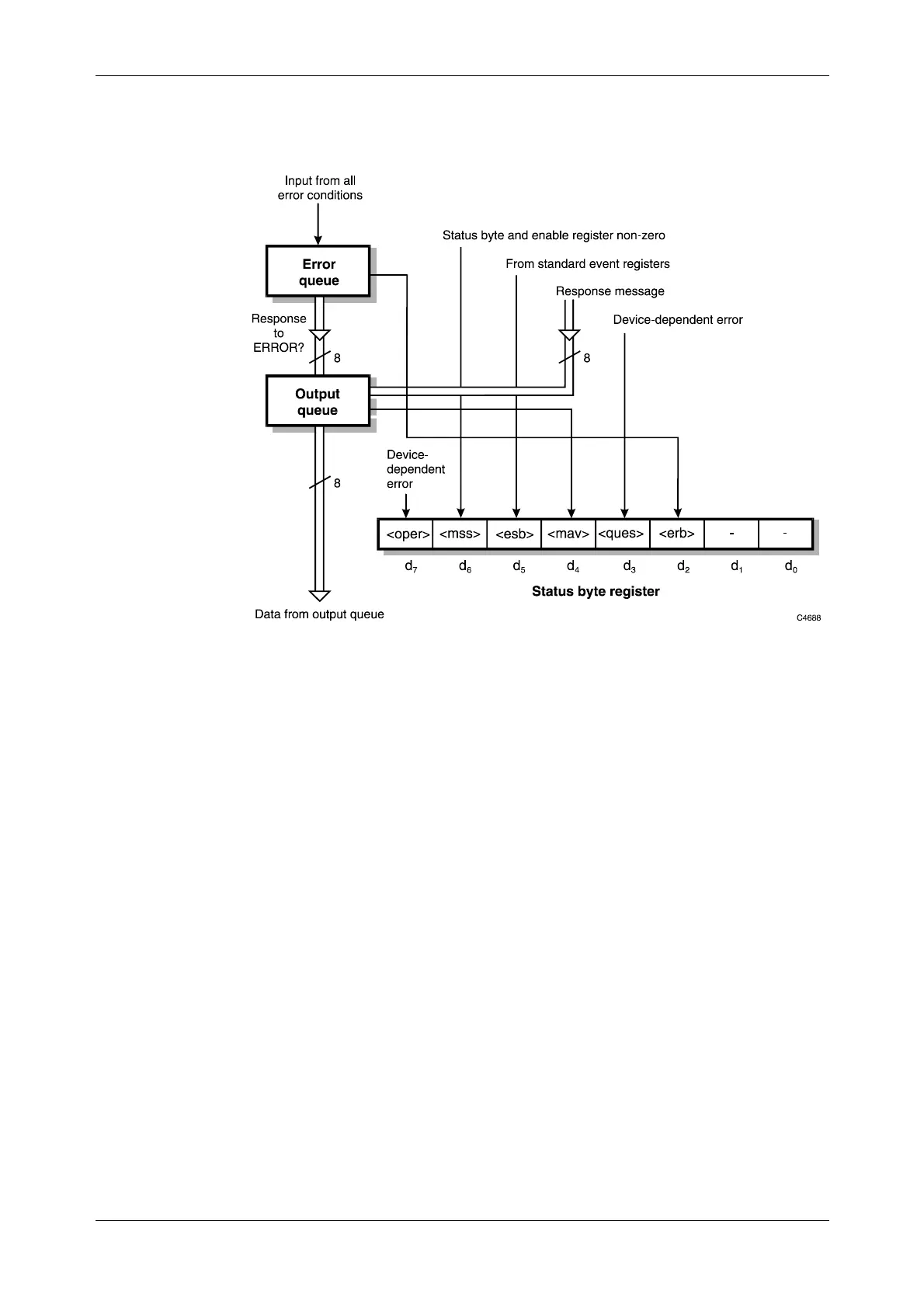 The <erb> status bit is set when one or more errors are present in the error queue. The ERROR?