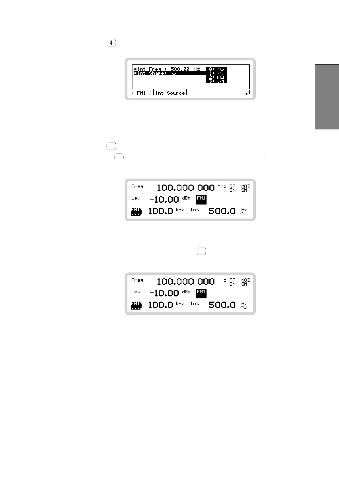 A 100 MHz, −10 dBm carrier, with 100 kHz deviation, modulated at 500 Hz, now appears at the
