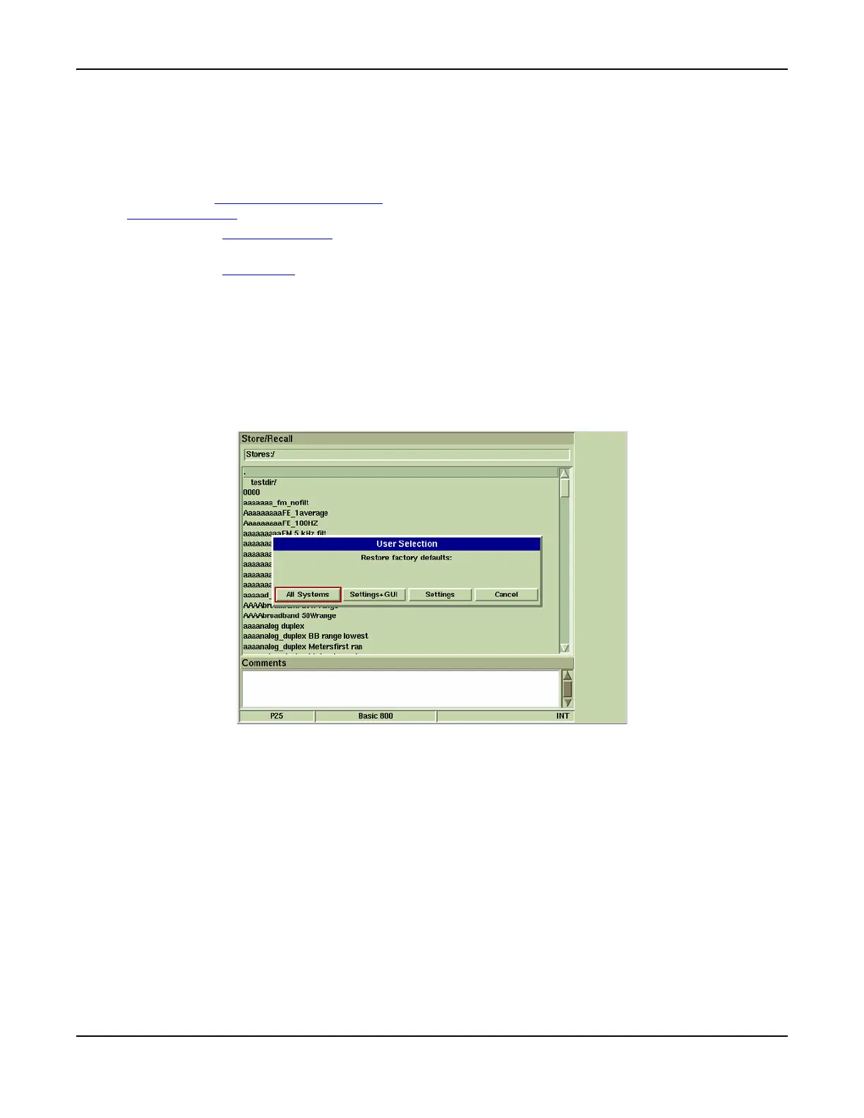 Restores GUI and data fields in all Test Systems to factory default settings. Test Set will reload