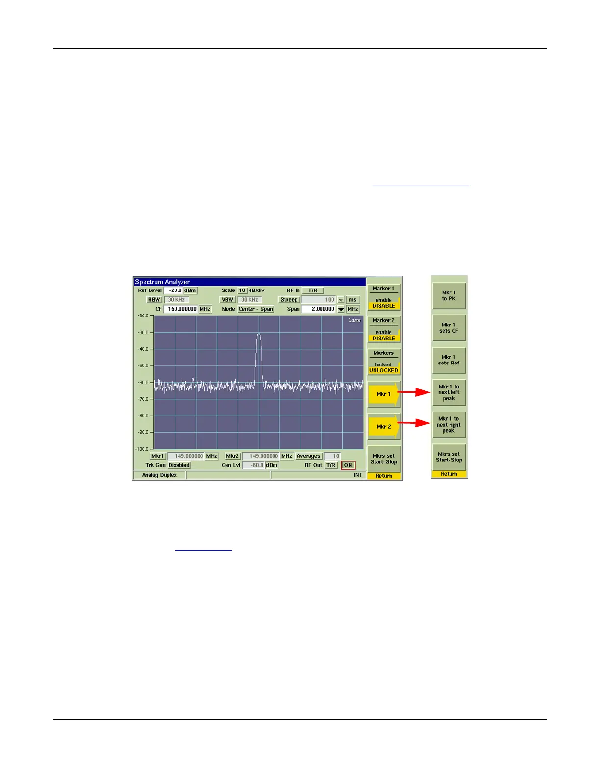 1. Enable marker(s) using the Mkr1 / 2 toggle buttons or by pressing the [Marker1 / 2] Soft