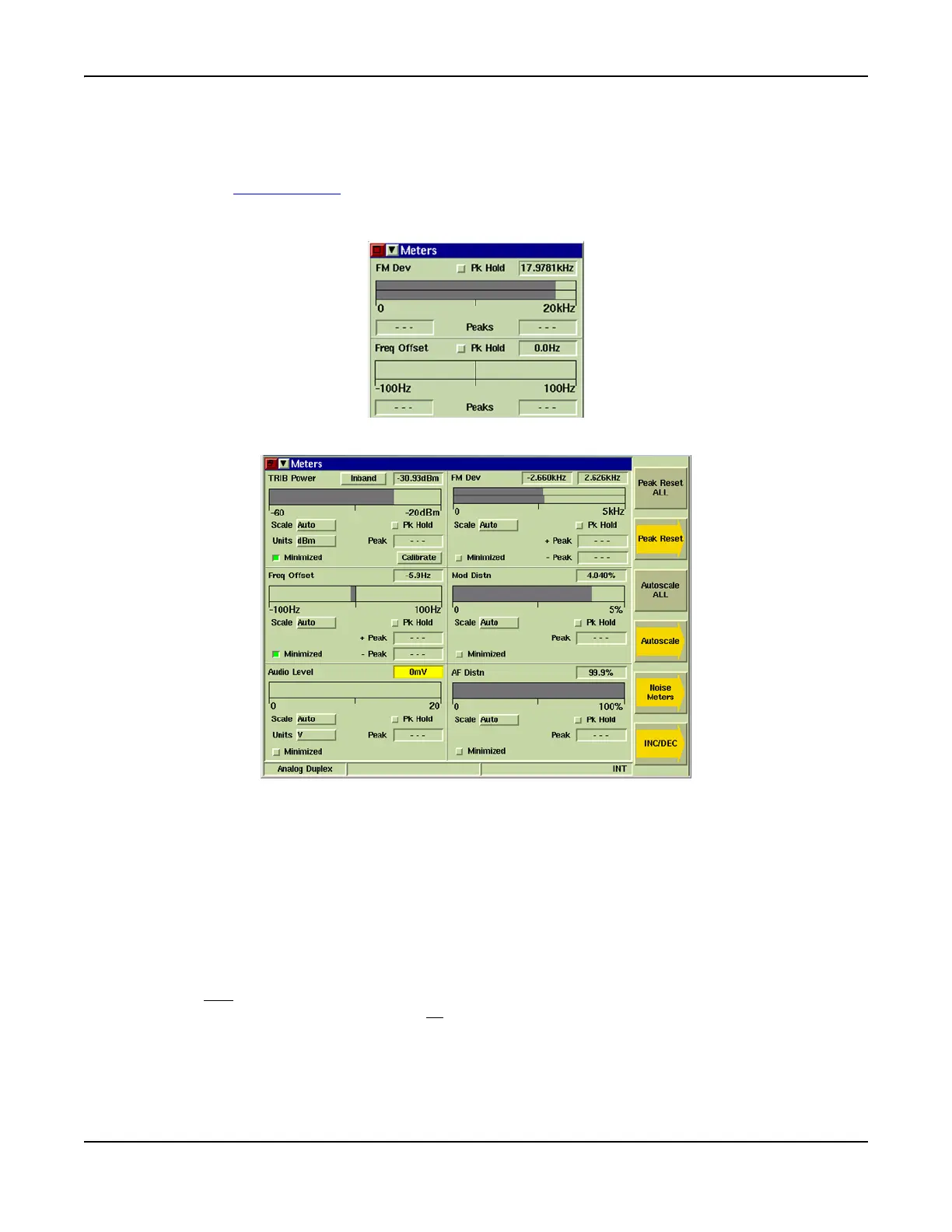 The Meters Tile displays the results of RF, AF and modulation measurements performed on signals