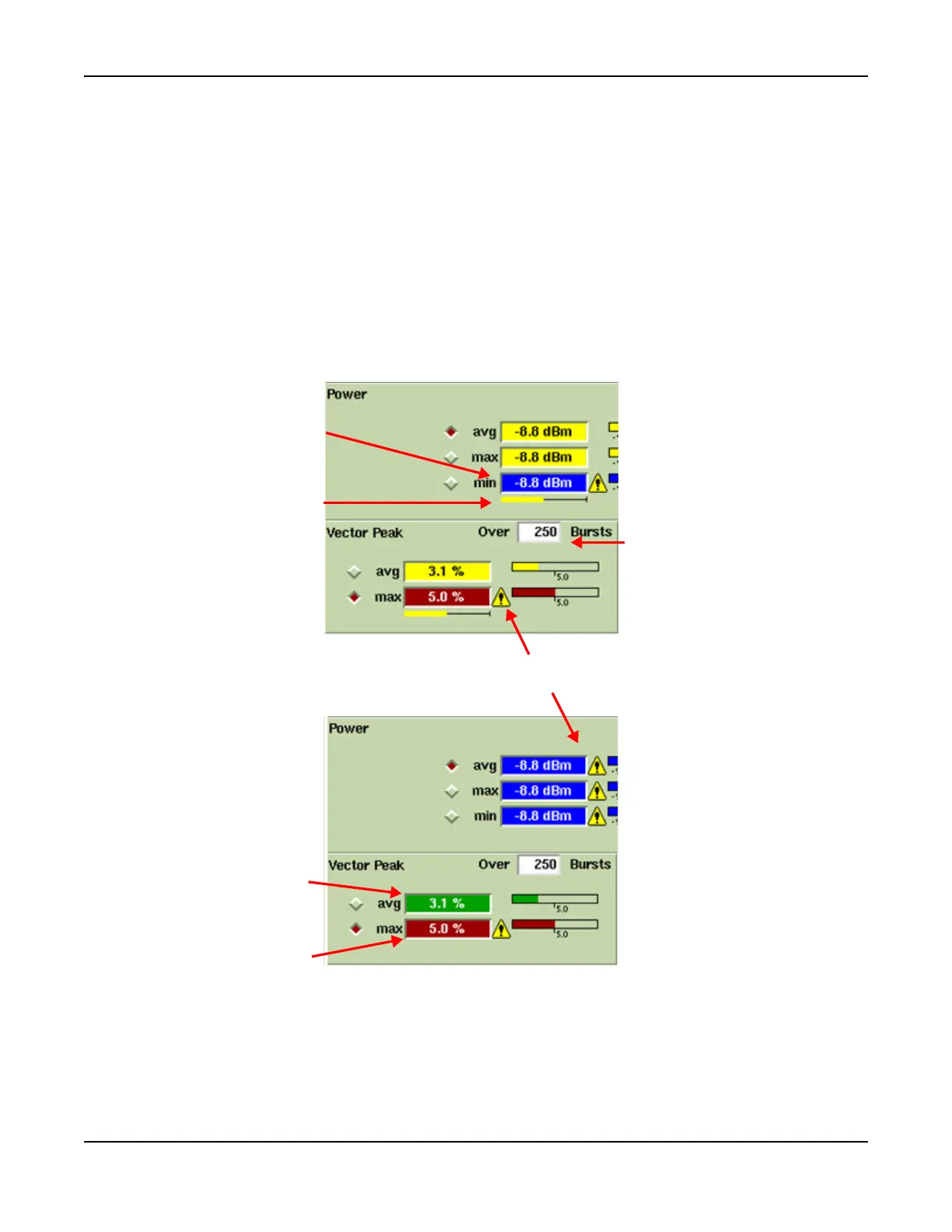 When test limits have been set, an alarm symbol ‘!’ appears to the right of the field when a