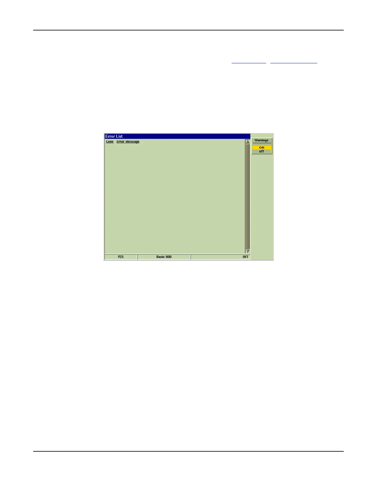 Screen displays a list of the last received errors. Refer to Appendix G, Error Messages for a