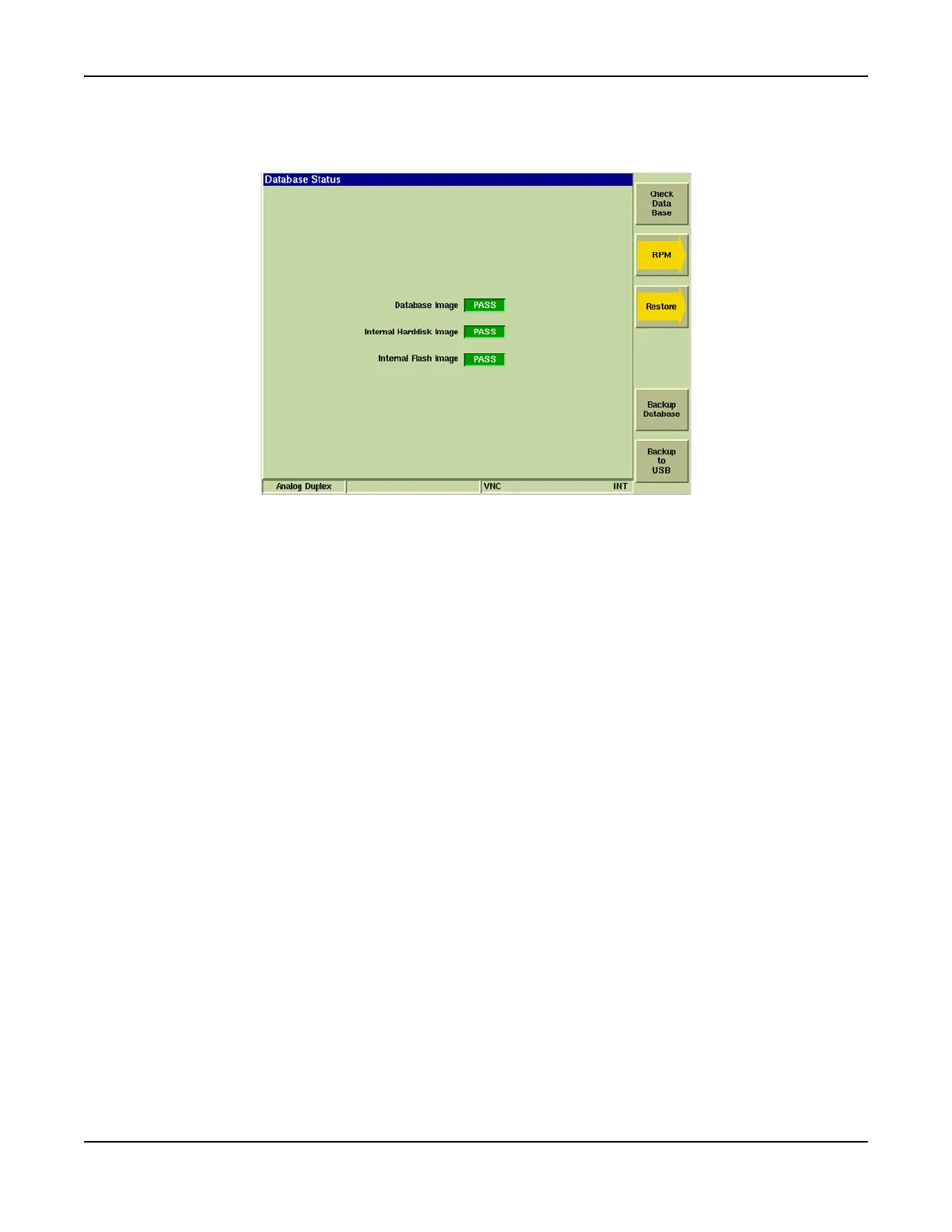 If Database Image FAIL(s), press the [Restore] Soft Key to restore calibration.