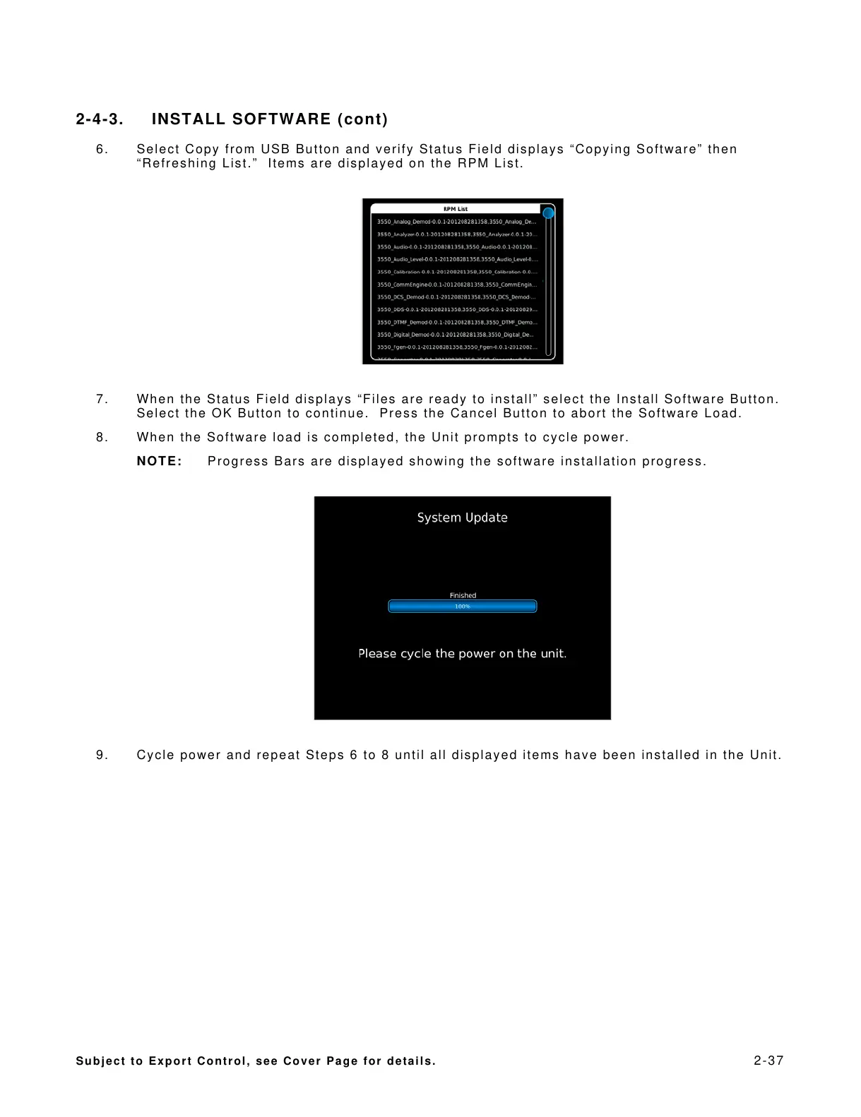 8. When the Software load is completed, the Unit prompts to cycle power.
