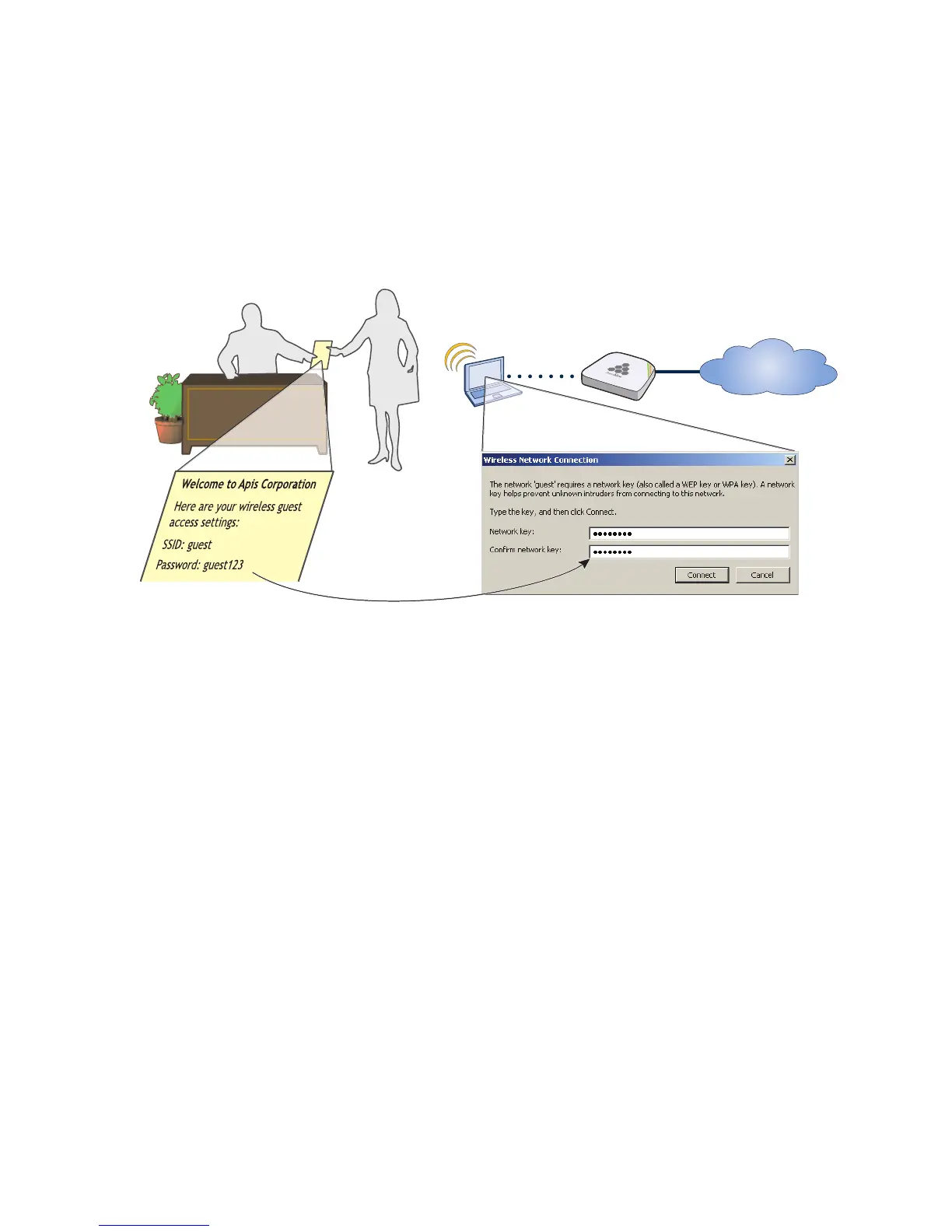 when associating with the guest SSID. A receptionist can provide visitors with the preshared key along with