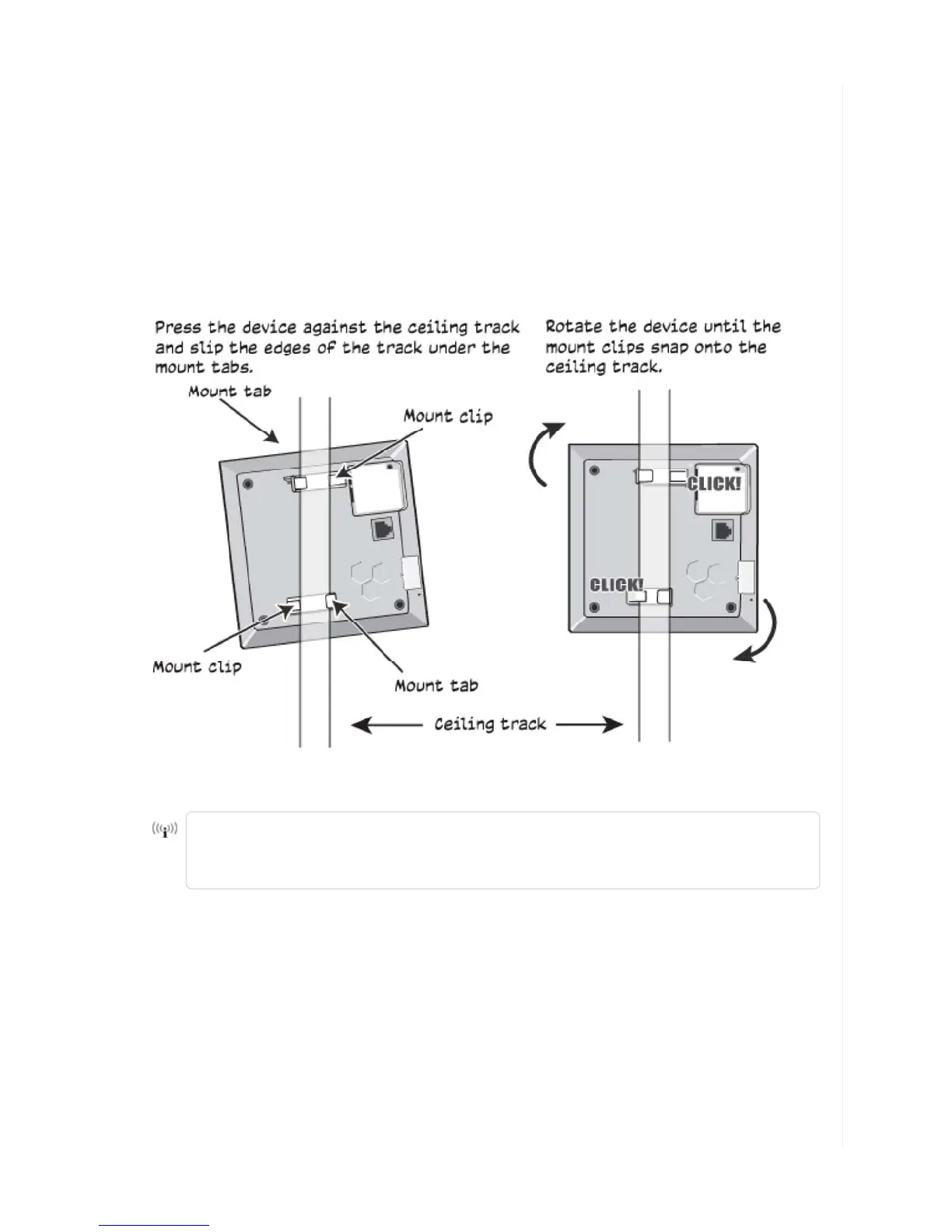 rotate the device slightly until the mount clips click into place over the track edges.