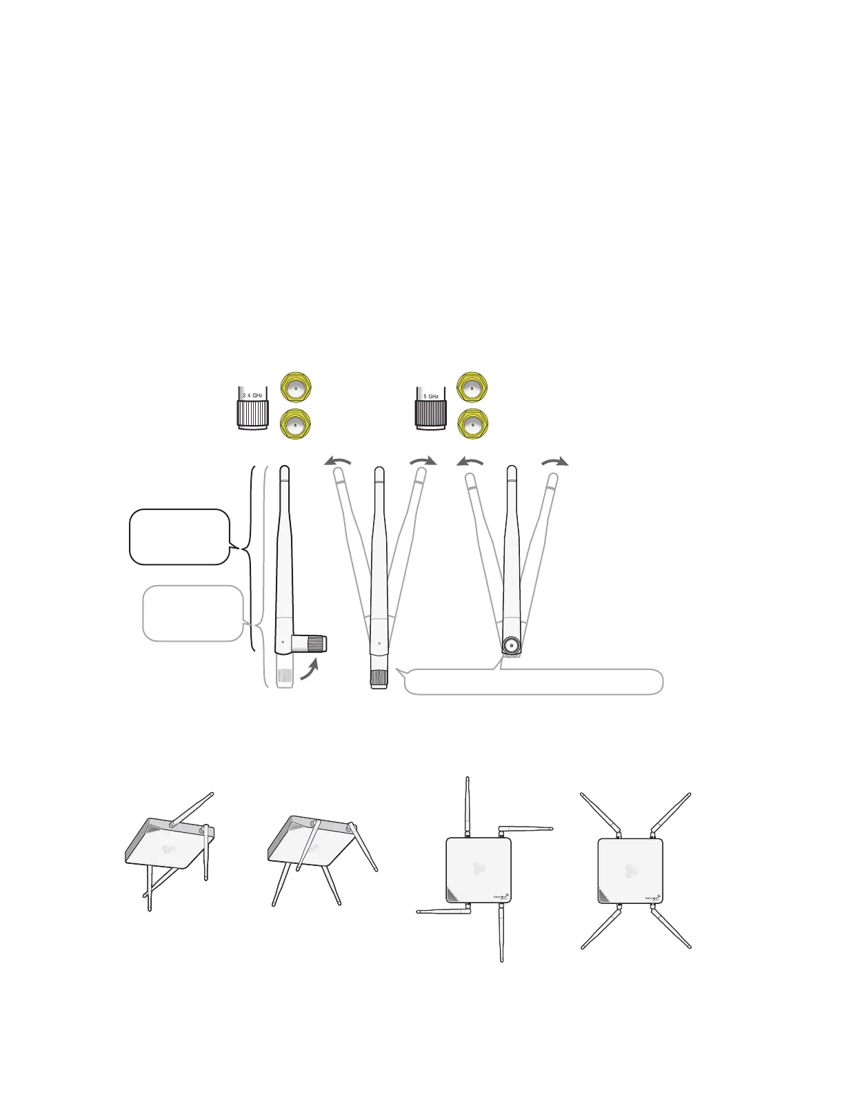 antenna connectors and four external articulated antennas (two 2.4 GHz and two 5 GHz). The external