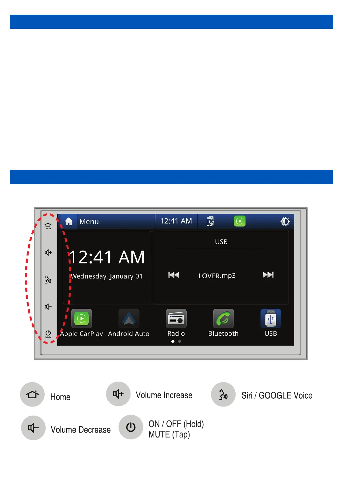 • Dual Rear USB: USB1: CP/AA/USB Media