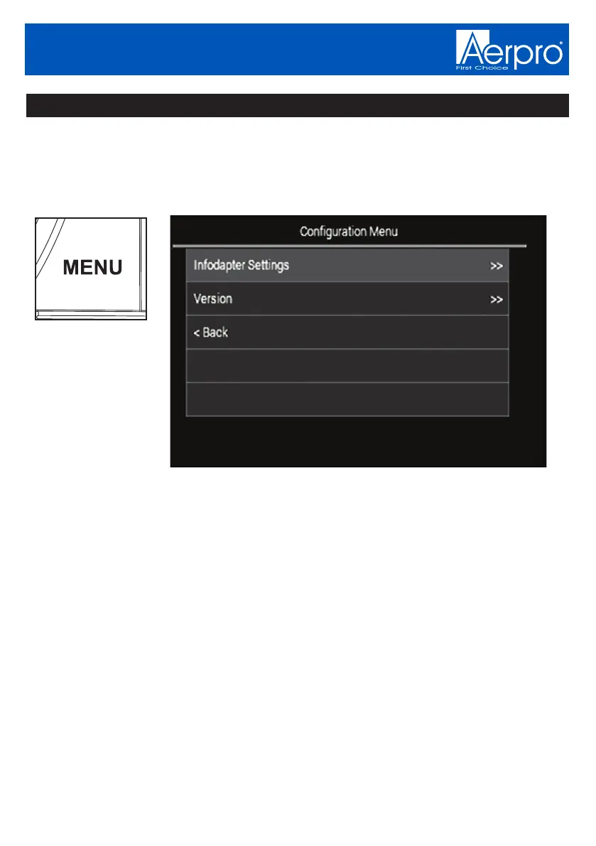 Menu. Press menu button to enter into sub menus and again to change settings.
