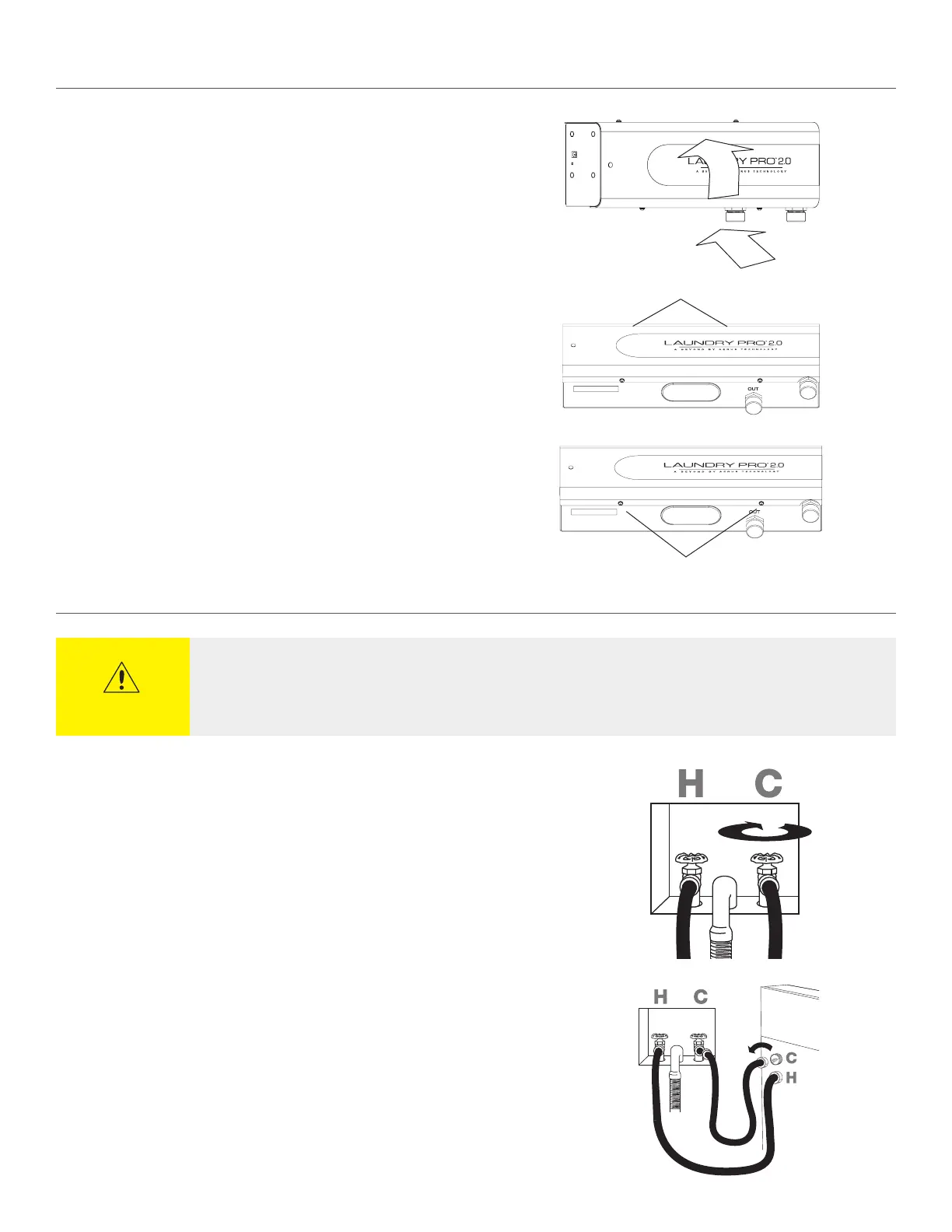 • Lors du raccordement des flexibles à votre dispositif Laundry Pro 2.0, vissez les raccords à la main. À l’aide d’une pince