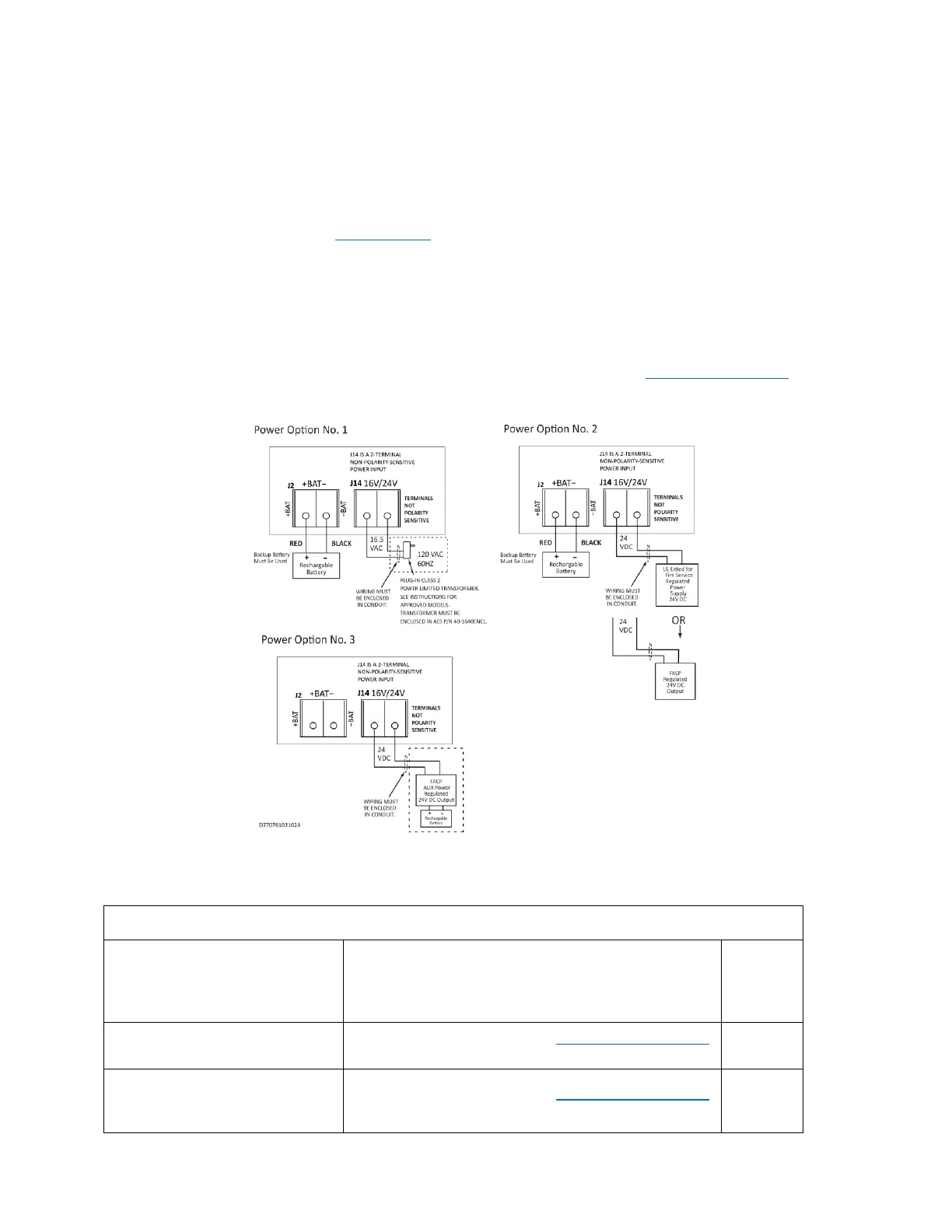 Battery size requirements are listed in the following table: