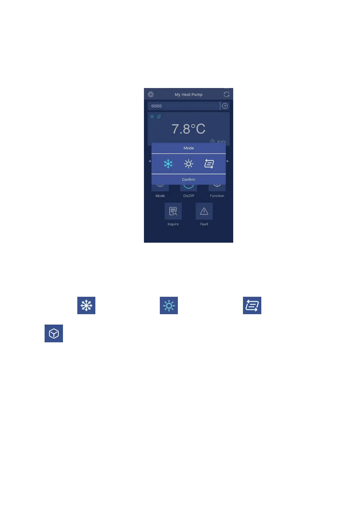 cooling mode, heating mode or auto mode. After selection, press Confirm to confirm.