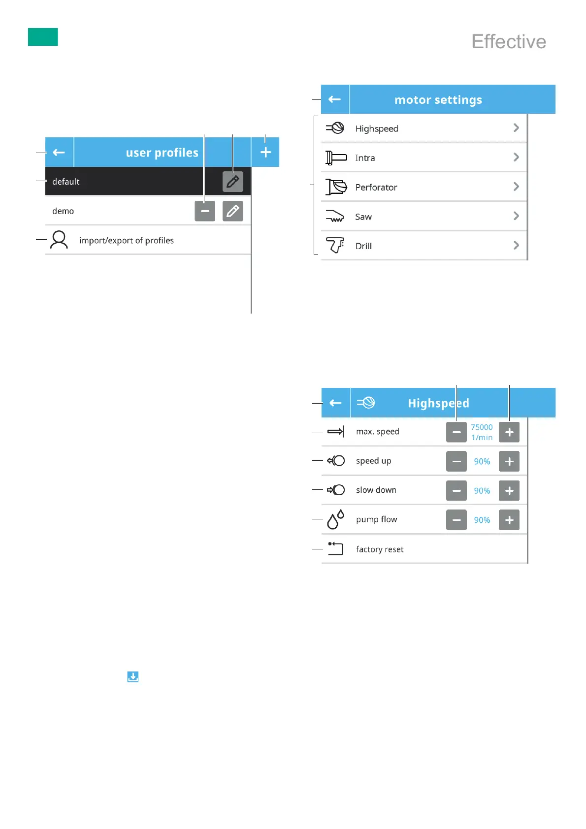 ► Change motor settings: Press button “Reduce value” h or “Increase
