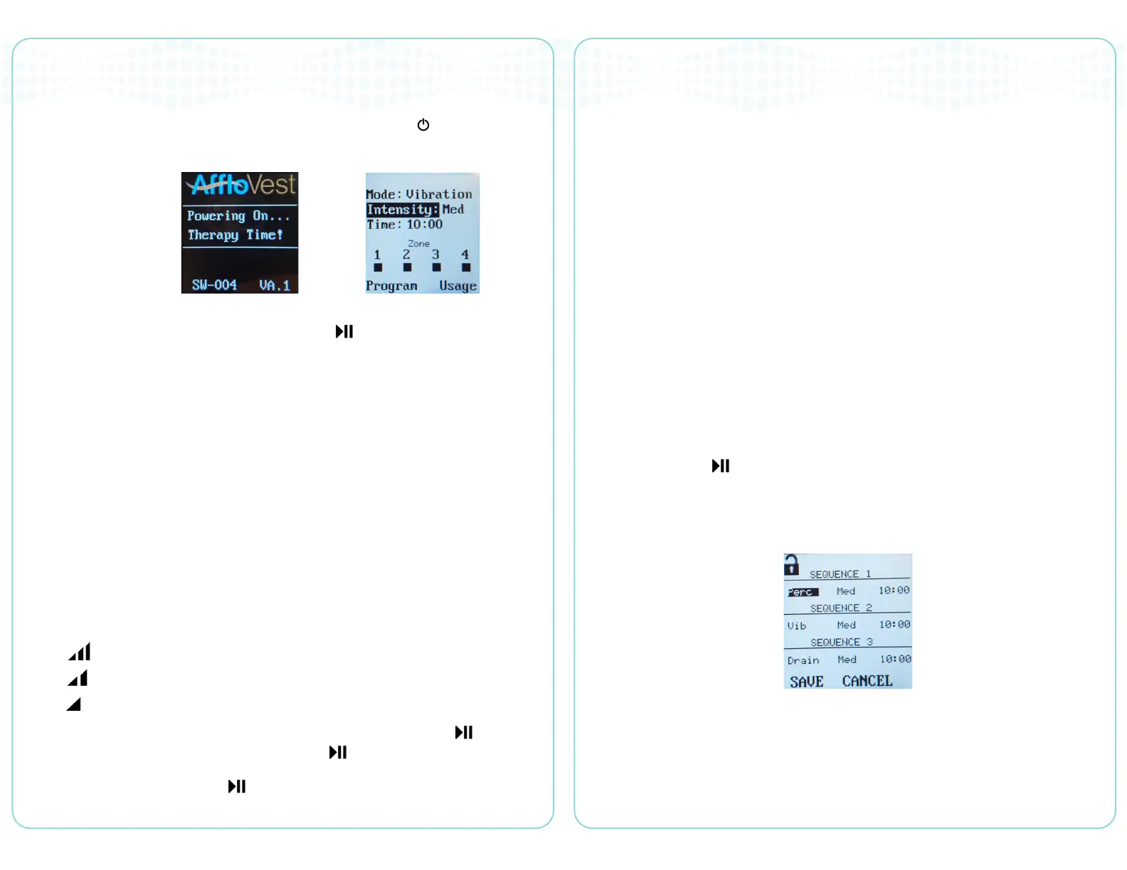 The AffloVest will start in the Medium intensity mode by default. Pressing the following