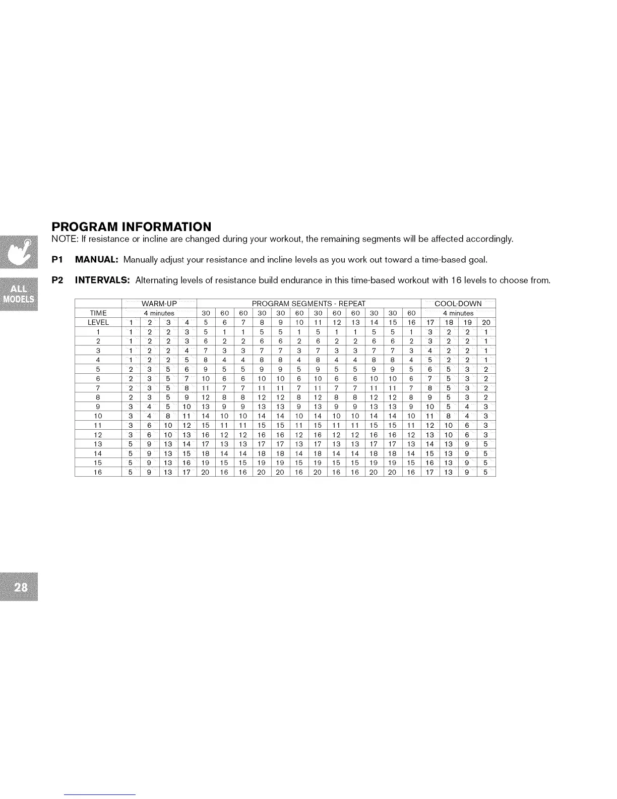 P1 MANUAL: Manually adjust your resistance and incline levels as you work out toward a time-based goal.