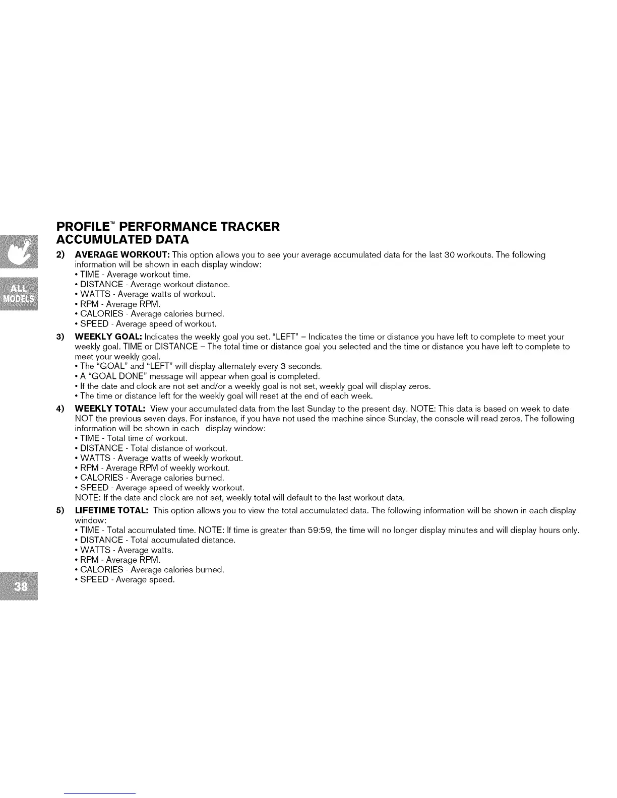 3) WEEKLY GOAL: Indicates the weekly goal you set. "LEFT" - Indicates the time or distance you have left to complete to meet your